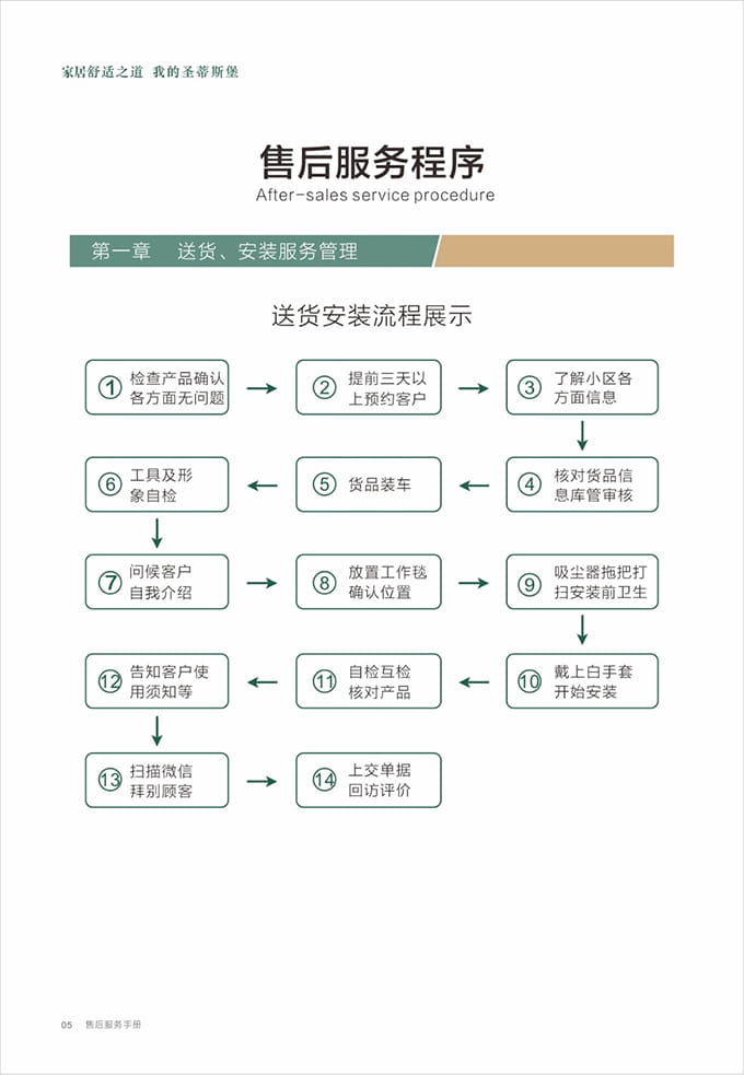 物資準備:上門前必須著圣蒂斯堡統(tǒng)一工作服,佩戴工作證,準備好安裝工具、搬抬工具(搬運背帶等)、備件、筆記本、手套、鞋套、地墊、衛(wèi)生清掃工具(清潔劑、抹布、掃把簸箕、拖把、吸塵器等)、瓶裝水、《圣蒂斯堡安裝施工指示牌》、收據(jù)和圣蒂斯堡產(chǎn)品說明書、《產(chǎn)品配送單》和《配送滿意度調查表》等物品。再帶上小禮品,例:鮮花或碳包去味禮包等。