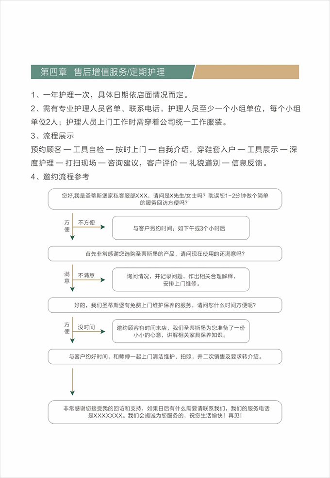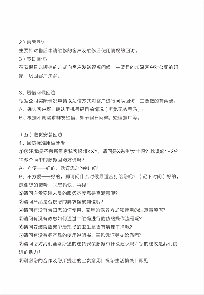 話術參考:“**先生/女士您好,我是圣蒂斯堡的售后服務人員**,您購買的圣蒂斯堡家具已經(jīng)全部到貨了,送貨安裝大約需要**時間,請問您這邊什么時候方便我們上門送貨安裝呢?”同時要了解送貨小區(qū)的電梯、樓道、入戶門的尺寸等,提前做好準備,避免意外情況。最后確定送貨時間(安裝所需要時長),并告知客戶安裝人員的相關信息,可加微信發(fā)送,并發(fā)送配送安裝流程說明。