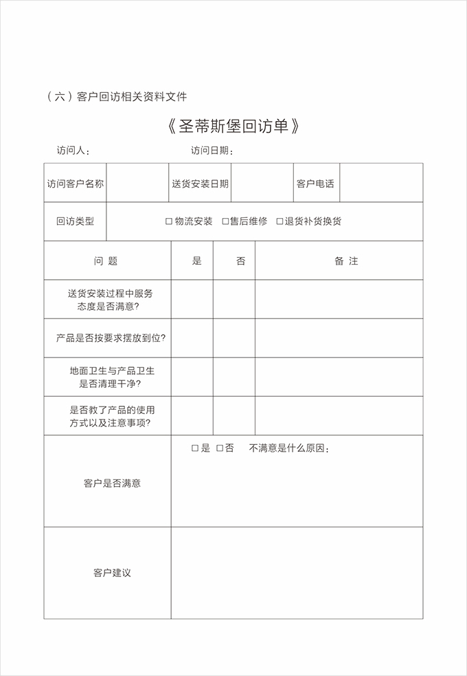 售后人員完成售后,將有客戶簽名的《產(chǎn)品配送單》《配送滿意度調查表》交給店面經(jīng)理。店面經(jīng)理根據(jù)處理完成結果登記存檔,并對客戶進行回訪,確定送貨安裝服務完成,并了解客戶對公司整個服務過程的滿意情況。