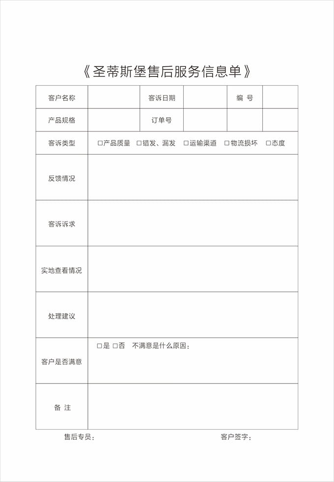 現(xiàn)場修復完成后,請客戶確認,在《圣蒂斯堡售后服務信息單》上簽字;不能現(xiàn)場修復時則必須跟客戶說明清楚,征得客戶同意后將產(chǎn)品帶回處理或返廠處理,應開具相關收據(jù)交予顧客,并且登記備案;修理完畢后按照配送流程送到顧客家后應向顧客索回收據(jù),并且請顧客在《圣蒂斯堡售后服務信息單》簽字。