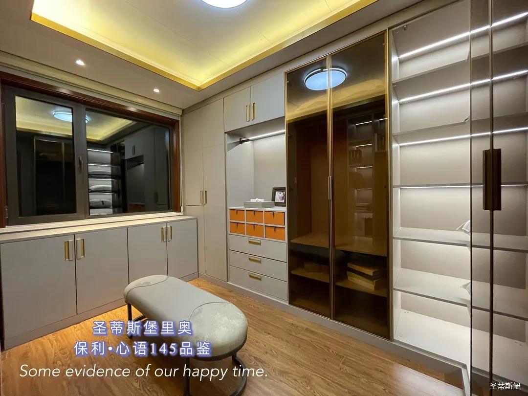 ▲衣帽間是用一間房改造的,衣柜開放式的布局處理,不但釋放了空間的狹隘,也營(yíng)造出了具有觀賞性的空間格局,淺灰色調(diào)打造柜體基底,凝練出現(xiàn)代簡(jiǎn)約的生活質(zhì)感。柜體中安裝感應(yīng)燈帶,光線流瀉其中,襯托出材質(zhì)的自然肌理,溫潤(rùn)細(xì)致的實(shí)木與剛硬冷冽的低奢金屬相互交織出一個(gè)極具質(zhì)感的儲(chǔ)物空間。