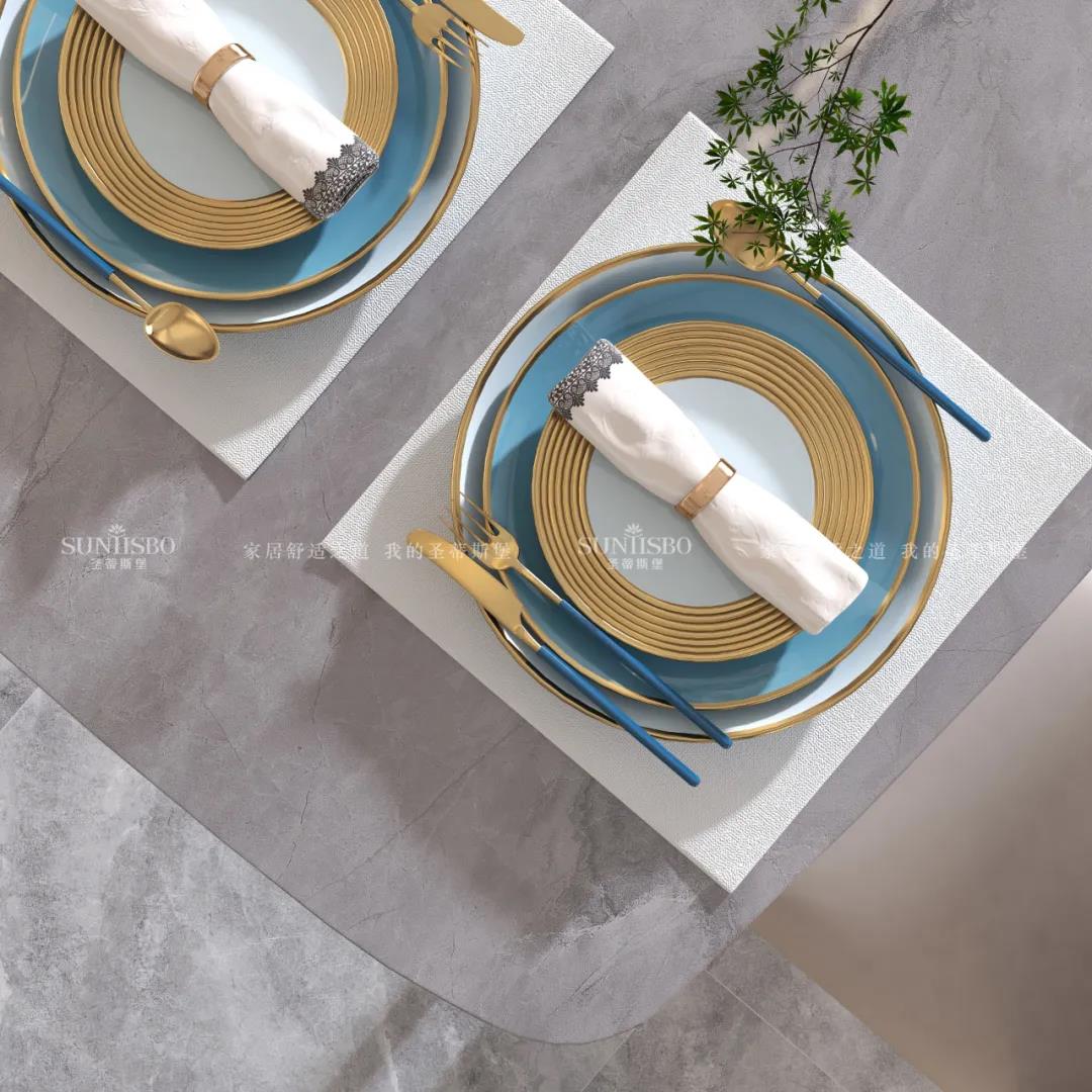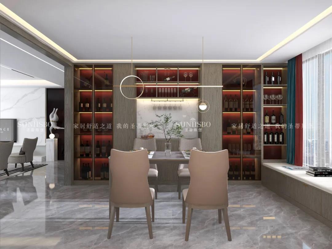簡奢餐桌與玻璃大立柜,將空間簡化,帶來了純粹的空間視覺效果。金色鑲邊的點(diǎn)綴,為這份純粹增添了奢華質(zhì)感。極簡玻璃定制柜體,拉開了大空間的開闊視野,光影交匯間,硬朗的氣質(zhì)與柔和的自然光產(chǎn)生了趣味的互動(dòng),為空間提供了更具藝術(shù)張力的奢享用餐體驗(yàn)。
