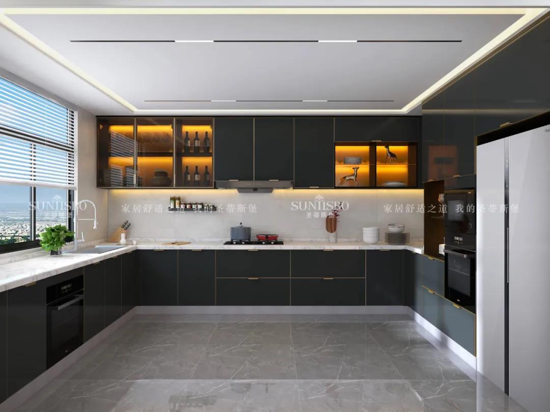 視覺色彩是激活感官的情緒支點(diǎn),以色彩為重心的櫥柜系統(tǒng),喚醒了簡奢廚房的關(guān)鍵所在。亮色金屬與深色實(shí)木柜體形成撞色櫥柜,極具空間爆發(fā)力。在深色柜體包裹中展現(xiàn)金屬、玻璃、實(shí)木的高級質(zhì)感,剛毅線條交錯(cuò)延續(xù),一秒就點(diǎn)燃了時(shí)尚潮流的生活態(tài)度。