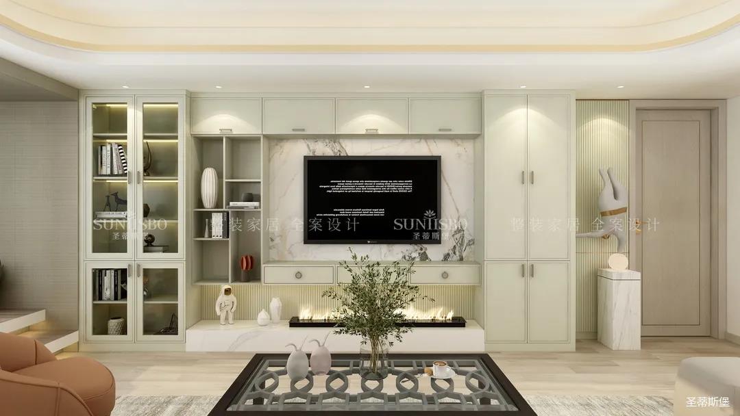 電視墻在客廳除了承擔(dān)著整體美觀之外,在小戶(hù)型的收納上也能承擔(dān)一些其他功能,比如小戶(hù)型收納問(wèn)題。如果你家有強(qiáng)烈收納需求,可以選擇定制柜體墻面,做成整墻收納柜體,安裝無(wú)拉手柜面,既滿(mǎn)足了日常收納需求,也融合了美觀的裝飾效果。