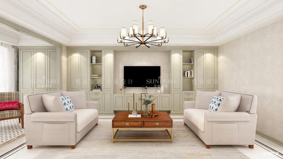 它以英倫爵士灰為柜體主調(diào),背景墻定制了整墻的儲(chǔ)物柜,色調(diào)懷舊復(fù)古的同時(shí)還夾帶著時(shí)尚摩登氣息,明暗收納合理分區(qū),電視被實(shí)木飾面包圍,使空間視覺(jué)得以延伸,美觀收納兩不誤。