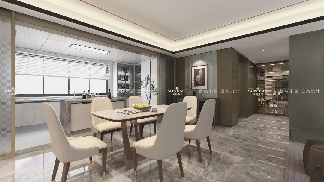 奶白色的餐桌椅搭配煙熏色的柜體,對于愛做飯的男主人來說他真的愛慘了,