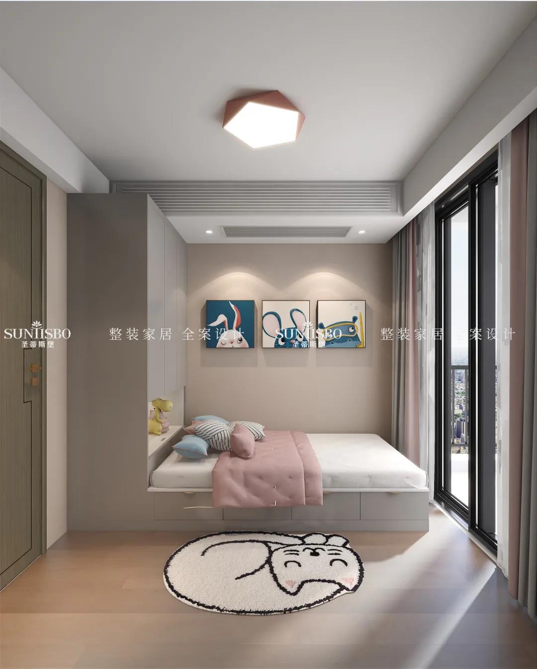 次臥的床采用的是米白色的象形方塊,白色的方塊搭配著莫蘭迪色系的墻,干凈、明亮、簡約、大氣。