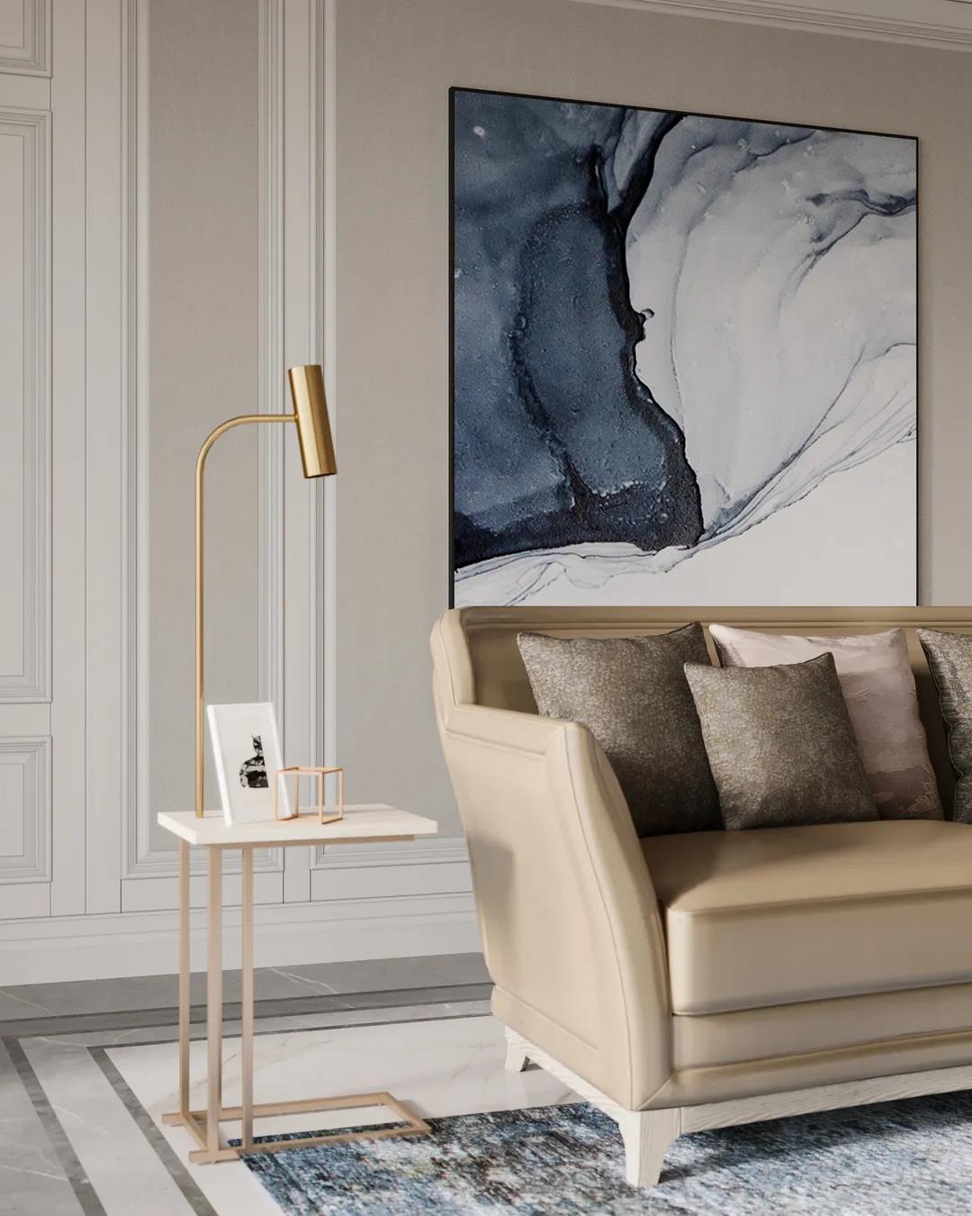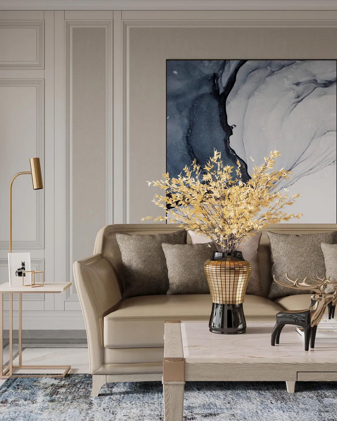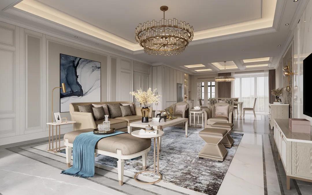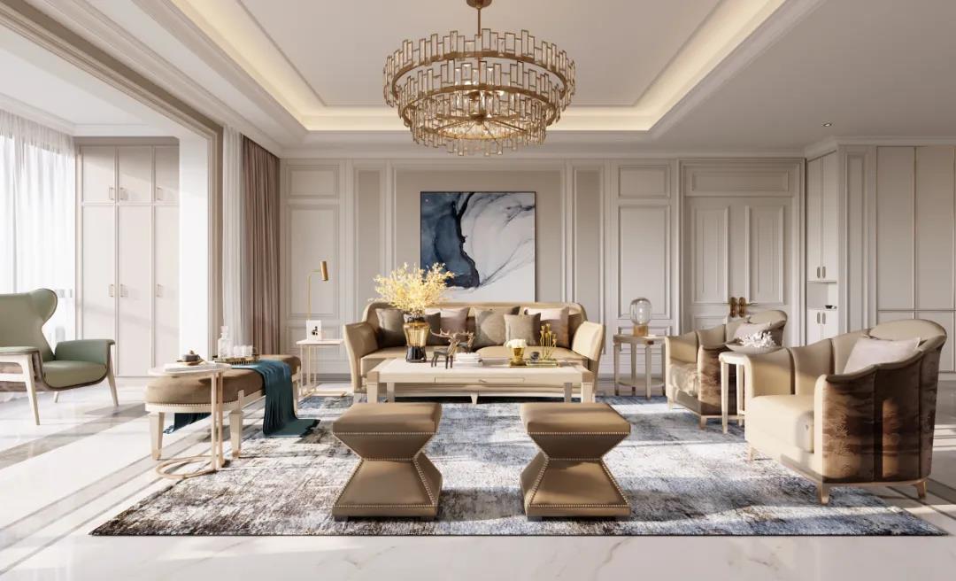 本案定位美式輕奢風(fēng)格,設(shè)計(jì)師提取了業(yè)主喜歡的顏色添加至空間中,并運(yùn)用金屬元素滲透到每一個(gè)空間,統(tǒng)一色調(diào)。在設(shè)計(jì)上,格局大而不空,以?xún)?yōu)美線條雕琢空間語(yǔ)言,材質(zhì)肌理間的碰撞融合,打造出層次豐富的藝術(shù)感。