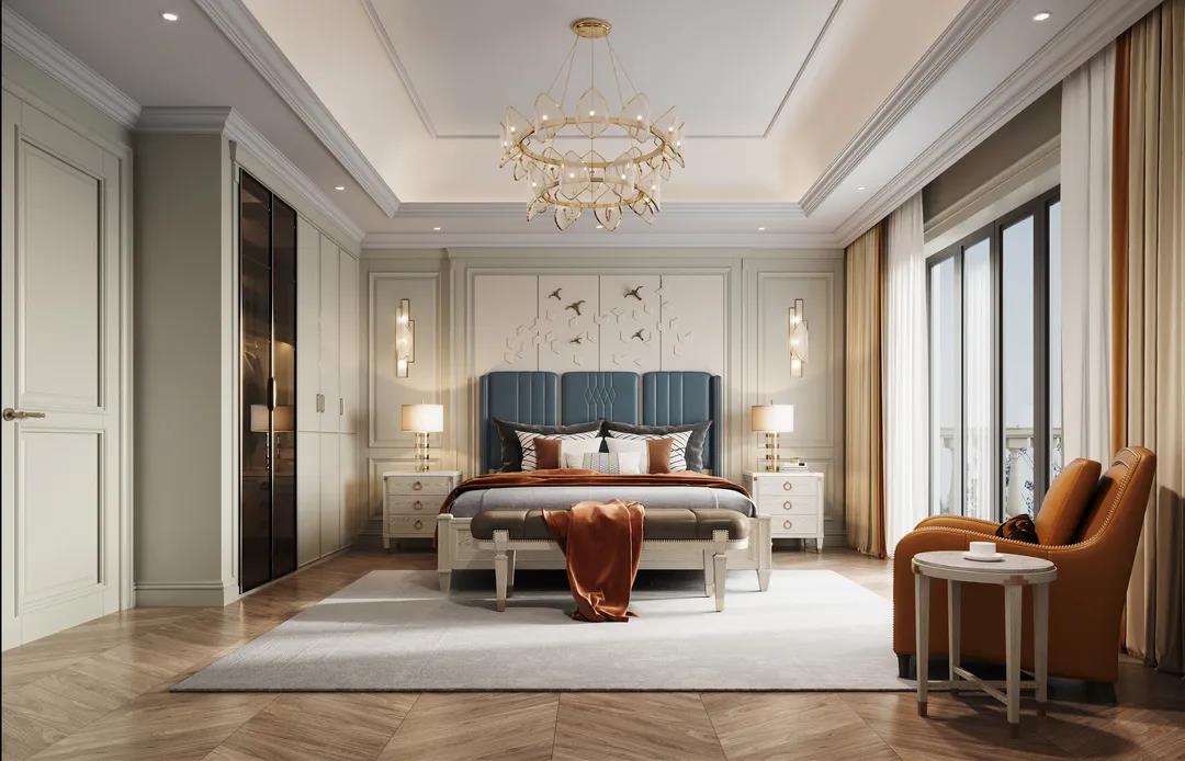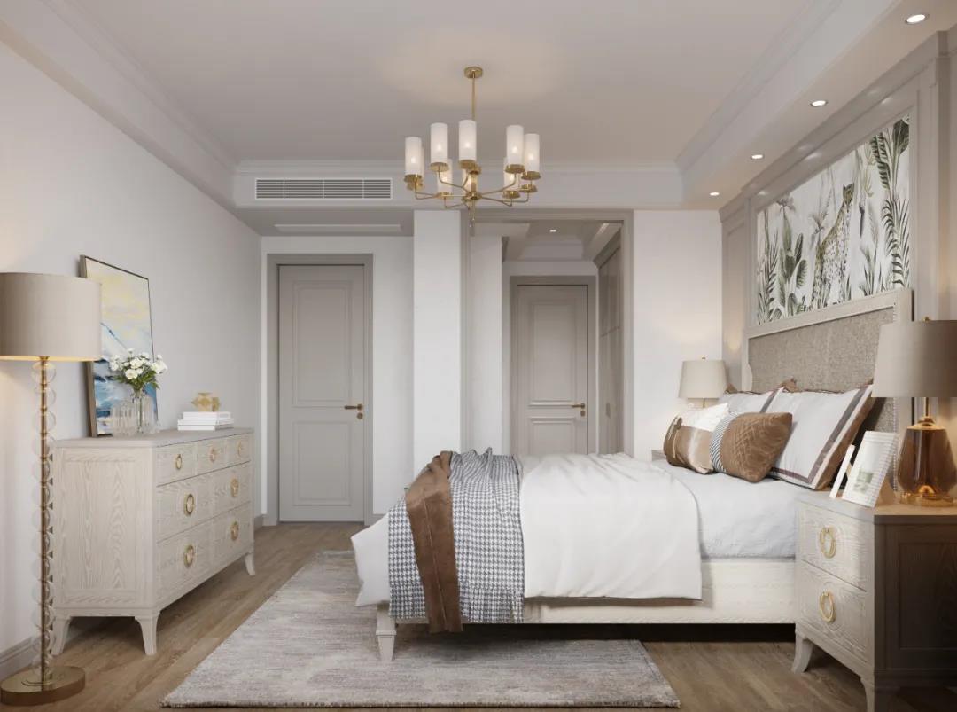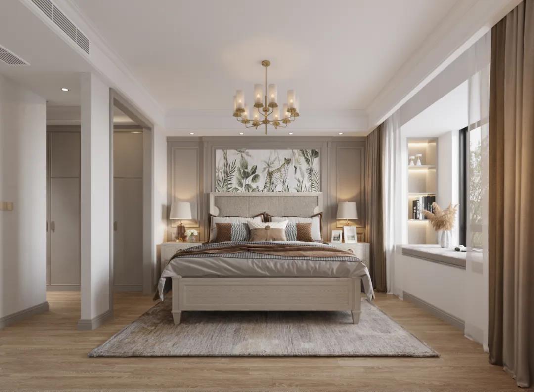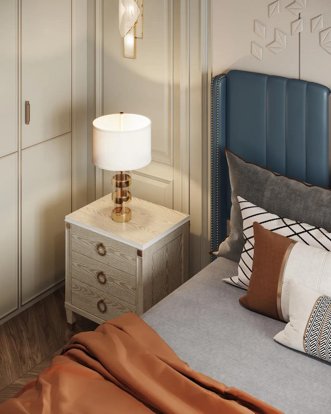 主臥以線條元素做主導(dǎo),軟包的床頭墻面充滿(mǎn)安全感,浮雕的造型給空間布局帶來(lái)了極佳的層次感,以現(xiàn)代美式輕奢框架為主題,融入了美式靈動(dòng)的線條,讓整個(gè)臥室既有時(shí)尚質(zhì)感,又有時(shí)光打磨后的穩(wěn)重。