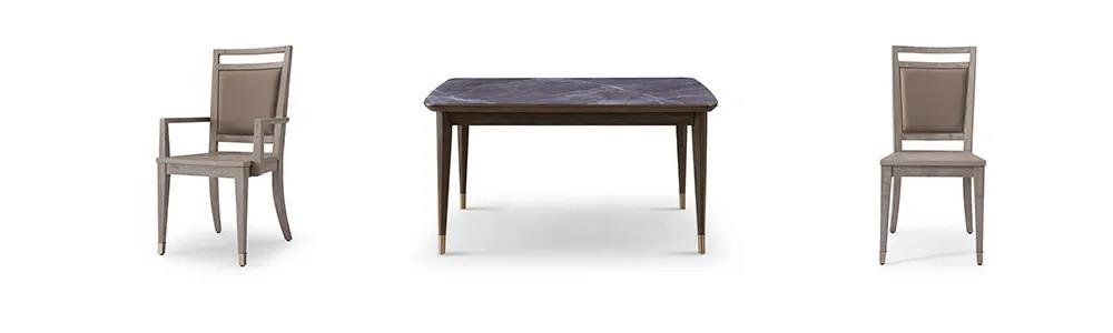 餐桌以簡潔干練造型為主,高級百搭的灰色調,軟包真皮,金屬鑲嵌的細節(jié),打造出悠閑奢華、優(yōu)雅精致的風格,讓家的味道從一日三餐中抵達內心深處。