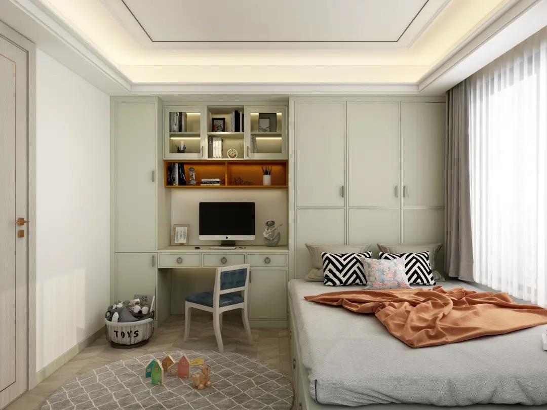 次臥背景墻兩端是對(duì)稱式設(shè)計(jì),以淡雅的暖色為主,