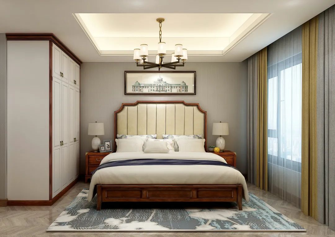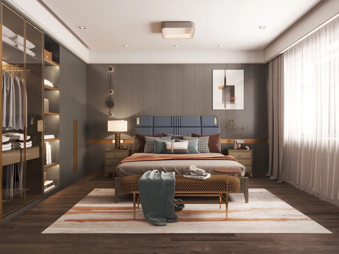 優(yōu)雅沉靜的霧霾藍床架,干凈利索的線條設(shè)計,天然的皮革紋路,與原木色的墻面相呼應(yīng),純粹、樸實,營造出輕奢簡約的氛圍,滿足了屋主對空間的無限暢想。