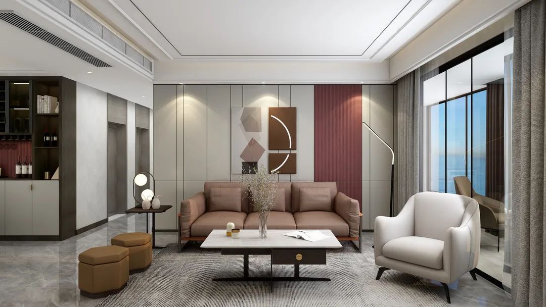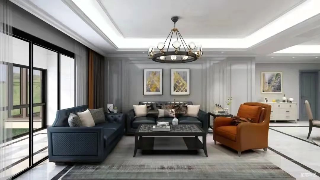 沙發(fā)皮色采用深淺不一的咖色拼接。讓空間顯得精致有質(zhì)感。在沙發(fā)的扶手邊框、底座,融入了愛馬仕橙,讓空間多了些靈動的生活氣息。搭配簡約單椅,給人一種視覺上的高級感。